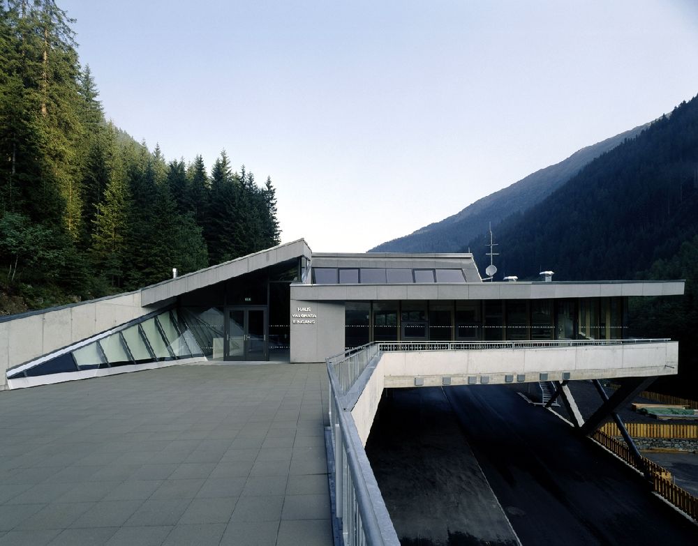 Der Hauptteil des Neubaus wird über der Landesstraße errichtet. Damit wird es möglich, die Außenanlage, den Zugang und die räumliche Wirkung des gesamten Areals in eindeutiger Weise zu ordnen. Durch den Aufbau auf das bestehende Feuerwehrgebäude ist eine genügende Durchfahrtshöhe gegeben. Eine Fluchttreppe stellt die Verbindung von der Sportanlage in das Foyer des Mehrzweckgebäudes her und dient gleichzeitig als externer Zugang für Schauspieler. Nicht öffentlich nutzbarer Grund (Straße) wird auf diese Weise optimal genutzt. Der Großteil des restlichen Grundstückes wird nicht verbaut. Ebene Flächen werden als öffentlicher Platz und für den Bauhof verwendet. Der nur schwer bebaubare Hang wird nicht berührt und eine aufwändige Hangsicherung vermieden. Der Platz: Gleichsam dem Gelände angepasst werden Recycling- und Bauhof an der Geländekante hergestellt. Das Dach dieser Bauteile bildet eine große Aufgangstreppe und einen neuen Platz vor dem Foyer. Dieser dem Gelände folgende, lang gezogene Baukörper bildet auf Straßenniveau die hangseitige Begrenzung eines Platzes, der im Bezug zur Sportanlage und zum Fluss steht und auch für Veranstaltungen oder zum Parken benutzt werden kann.