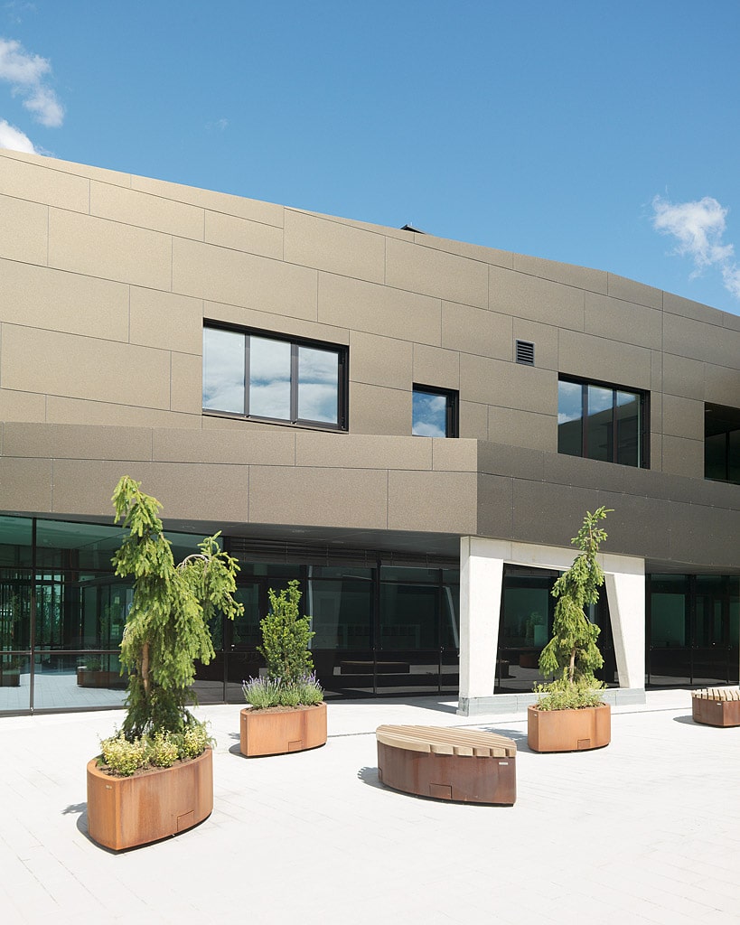 Durch den vorgeschlagenen U-förmigen Baukörper entstehen optimal nutzbare Außenräume. Der Eingangsbereich von Norden her kann als Campus dienen und den Studierenden schattige Lern- und Aufenthaltsplätze im Sommer bieten. Im Süden entstehen großzügige Terrassenflächen für das Audimax, die Cafeteria, die Aula und den Freibereich des Kindergartens. Großzügig überdachte Bereiche bieten Platz für Lernecken, Kommunikations- und Rückzugszonen, sowie Platz für Fahrräder. Das Kinderbetreuungszentrum wurde deshalb an der Südost-Ecke des Gebäudes angeordnet, da die Kinderbetreuung hauptsächlich am Vormittag/ frühen Nachmittag stattfindet, und dieser Gebäudebereich von der Ost- und der Südsonne erreicht wird.