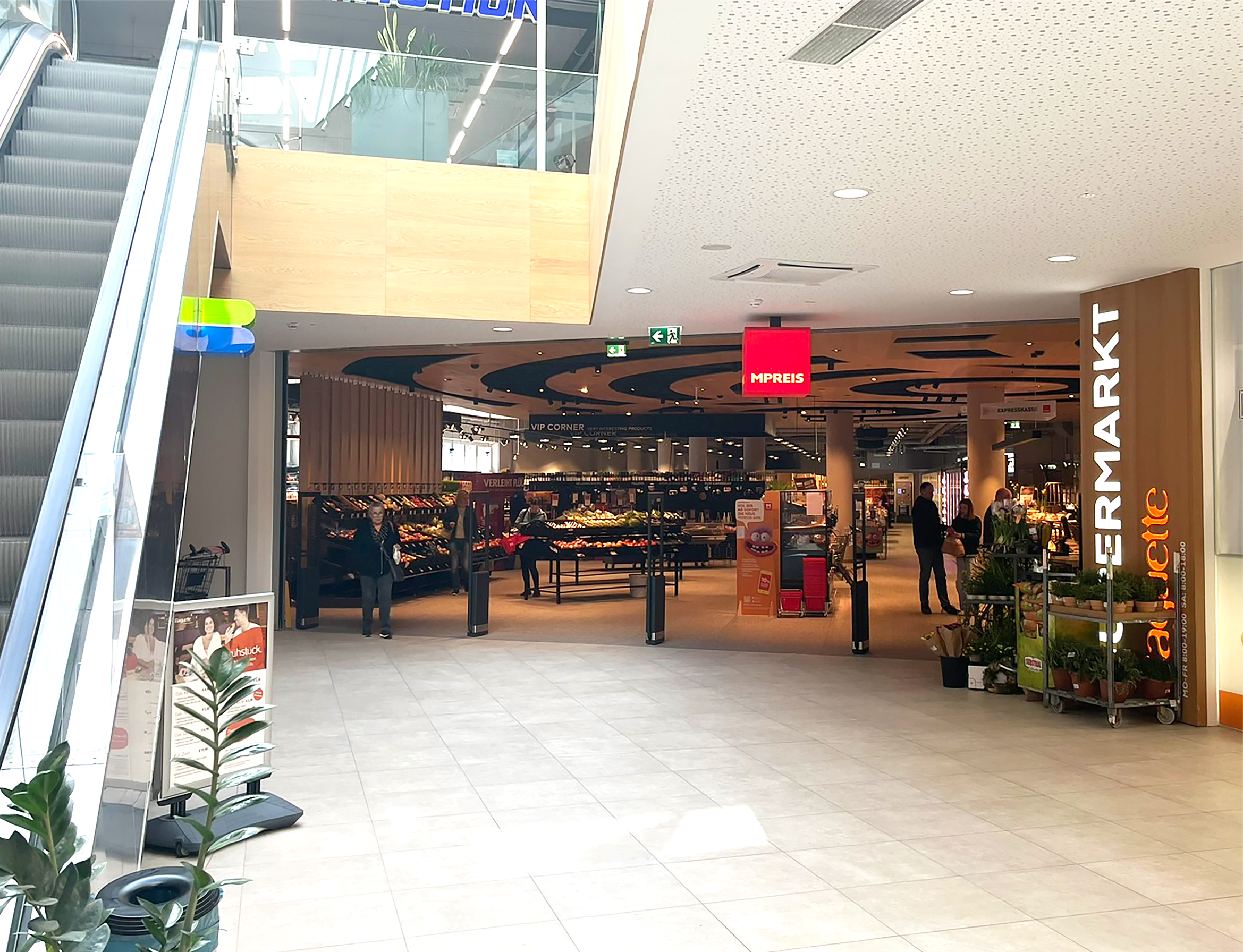 Im Zuge der Erweiterung eines Einkaufszentrums wurde ein MPREIS Lebensmittelmarkt in den Ausbau integriert. Das Herzstück des Verkaufsraumes ist die abgehängte Holzdecke. Mattighofen zählt heute zu den wichtigsten Wirtschaftsstandorten Oberösterreichs. Mit der Marke KTM und ihrer Räderproduktion wurde damit dazu der Grundstein gelegt. Die ausgenommenen „Räder“ zeigen hier eine formale Hommage an diesen einstiegen Siegeszug und den Aufschwung der Stadt.